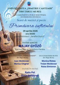 Universitatea „Dimitrie Cantemir” din Târgu Mureș, are onoarea de a vă invita la spectacolul aniversar „Primăvara Sufletului”, un eveniment dedicat artei, sensibilității și puterii iubirii de a aduce oamenii împreună, ocazionat de împlinirea a 35 de ani, de la înființarea Universității Dimitrie Cantemir din Târgu Mureș.